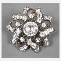 2. Hälfte 19. Jh., Silber geprüft, in Form einer stilisierten, durchbrochen gearbeiteten Blüte, besetzt mit zahlreichen Bergkristallen in verschiedenen Schliffformen, minimale Tragespuren, D ca. 35 mm, G ca. 10 g.