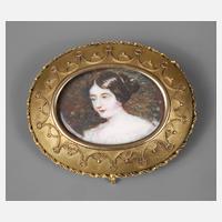 Mitte 19. Jh., Metall vergoldet, ovale, leicht konvex gebogene Porzellanplatte mit feiner Portraitmalerei einer jungen Frau, umgeben von kordiertem Draht und spitzartigem Zierwerk, leichte Tragespuren, Maße ca. 55 x 50 mm.