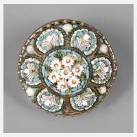 Ende 19. Jh., Silber geprüft und Messing, vollflächig belegt mit Mikromosaik und kordierten Drähten, eingefasst in Messingband, teilweise Verluste, D ca. 22 mm, G ca. 11,3 g.