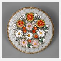 1. Hälfte 20. Jh., Metall vergoldet, belegt mit feinem Mosaik aus Glaspastestückchen, umgeben von zwei Bändern aus kordiertem Draht, D 40 mm.