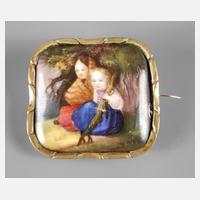 Ende 19. Jh., Messing, kissenförmige, konvex gebogene Porzellanplatte, bemalt mit Kinderszene, seitlich kleiner Ausbruch, alt repariert, Maße ca. 35 x 37 mm.