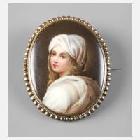 Ende 19. Jh., Messing, besetzt mit ovalem, leicht konvex gebogenem Porzellanmedaillon, hierauf Darstellung einer über die Schulter blickenden jungen Frau vor monochromem Grund, leichte Altersspuren, Maße ca. 52 x 43 mm.