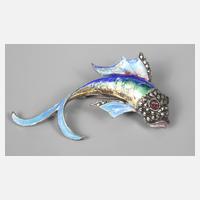 2. Hälfte 20. Jh., Silber gestempelt 935, naturalistische Darstellung eines springenden Fisches, Körper mit transluzidem Email, teilweise besetzt mit Markasiten und Granat als Auge, leichte Tragespuren, Maße ca. 22 x 45 mm, G ca. 5,4 g.