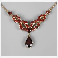 Ende 20. Jh., Gelbgold gestempelt 333, Mittelteil besetzt mit zahlreichen Granaten von unterschiedlicher Größe und Form, an gedrückter Kette, Federringverschluss, L ca. 42 cm, G ca. 7,2 g.