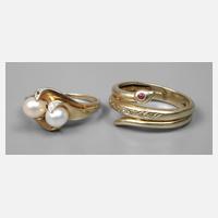 Ende 20. Jh., Gelbgold gestempelt 585, 1) in Form einer gewundenen Schlange, besetzt mit drei Diamanten und einem Rubin, 2) Ring mit ca. 12 mm hohem Ringkopf, besetzt mit zwei Zuchtperlen und Diamanten (ein Stein fehlt), jeweils leichte Tragespuren, RW 18,5 mm, G gesamt ca. 7,6 g.