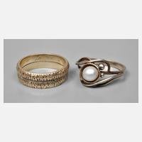Mitte 20. Jh., Gelbgold gestempelt 585 und 333, 1) Damenring mit ca. 11 mm hohem Ringkopf, besetzt mit Zuchtperle, RW 16,5 mm, 2) Bandring aus zwei verbundenen Eheringen, RW 16,5 mm, jeweils leichte Tragespuren, G gesamt ca. 7,7 g.