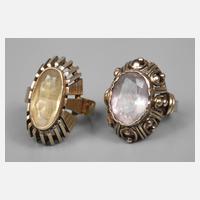 Mitte 20. Jh., 1) Gelbgold gestempelt 333, ca. 22 mm hoher Ringkopf, besetzt mit ovalem facettierten Amethyst, Tragespuren, RW 16 mm, 2) Gelbgold gestempelt 585, ca. 23 mm hoher Ringkopf, besetzt mit ovalem facettierten Citrin, leichte Tragespuren, RW 17 mm, G gesamt ca. 12,3 g.