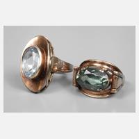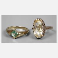 20. Jh., Gelbgold gestempelt 333, 1) ca. 18 mm hoher Ringkopf, besetzt mit oval facettierten Citrin, RW 17,5 mm, leichte Tragespuren, 2) zum Ringkopf hin leicht geschwungene Ringschiene, besetzt mit quadratisch geschliffenem Blautopas, RW 17 mm, G gesamt 6,2 g.