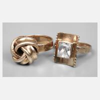 2. Hälfte 20. Jh., Gelbgold gestempelt 333, ca. 15 mm hoher Ringkopf, besetzt mit rechteckigem Bergkristall in Zargenfassung und Ring mit Ringkopf aus ineinander verschlungenen Bändern, leichte Tragespuren, RW ca. 16 mm, G gesamt 10,2 g.