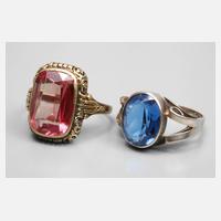 1. Hälfte 20. Jh., Gelbgold gestempelt 333 und 585, jeweils besetzt mit facettiertem, synthetischem Korund in Zargenfassung, leichte Tragespuren, RW 16 und 18 mm, G gesamt 7,7 g.
