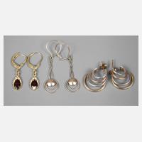2. Hälfte 20. Jh., Rot-, Weiß- und Gelbgold, gestempelt 333, 1) ein Paar zierliche Ohrhänger, L ca. 42 mm, 2) besetzt mit facettiertem Granat in Krappenfassung, L ca. 29 mm, 3) ein Paar Ohrstecker aus verschiedenen Goldlegierungen, L ca. 16 mm, je leichte Tragespuren, G gesamt ca. 4,7 g.