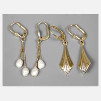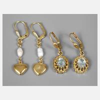 um 2000, Gelbgold gestempelt 333, 1) mittig besetzt mit facettiertem Aquamarin in Krappenfassung, L ca. 28 mm, 2) besetzt mit Süßwasserzuchtperle und abgehängten Herzchen, L ca. 38 mm, jeweils leichte Tragespuren, G zusammen ca. 4,5 g.