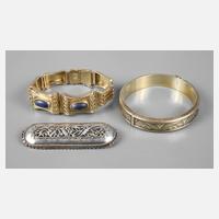 um 1920, Silber gestempelt 800 und teilweise vergoldet, bestehend aus ca. 13 mm breitem Armreif mit Kastenschloss und Sicherheitsacht, D max. 60 mm, Armband, besetzt mit zwei Lapislazulicabochons mit verdecktem Kastenschlosss und zwei Sicherheitsachten, L ca. 17 cm, sowie einer durchbrochen gearbeiteten Brosche von ca. 24 x 71 mm, unterschiedliche Erhaltungen, G gesamt ca. 71,2 g.
