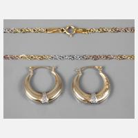 Ende 20. Jh., Kette Weiß-, Rosé- und Gelbgold gestempelt 585, L ca. 45 cm, Paar Creolen Gelbgold 333 geprüft, besetzt mit je einem Diamanten, G gesamt ca. 3,3 g.