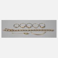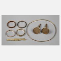 20. Jh., Gelbgold gestempelt 333, bestehend aus vier Eheringen, einem Paar Manschettenknöpfen, einem Armreif und einer Brosche, G gesamt ca. 27,2 g.