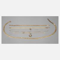 2. Hälfte 20. Jh., Gelbgold gestempelt 333, bestehend aus ca. 5 mm breiter geflochtener Kette, L ca. 42 cm und passendem Armband, L ca. 20 cm (defekt), einem weiteren Armband, L ca. 19,5 cm sowie zwei Ketten und einem Anhänger mit Aquamarin, G gesamt ca. 11 g.