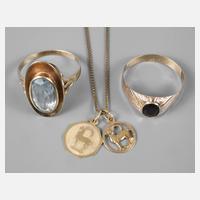 20. Jh., Rosé- und Gelbgold gestempelt 333 bzw. geprüft, 1) Damenring mit synthetischem Aquamarin in Zargenfassung, RW 23 mm, 2) Damenring mit facettiertem Granat, RW 23 mm, 3) Venezianerkette mit zwei Anhängern, unterschiedliche Erhaltungen, G gesamt ca. 13,1 g.