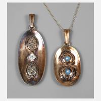 um 1970, Gelbgold gestempelt 333, unter Verwendung historischer Schmuckstücke, besetzt mit Bergkristall, Saatperle und türkisfarbenen Glascabochons, Maße ca. 49 x 18 mm und 39 x 18 mm, Tragespuren, beigegeben 47 cm lange Kette, G gesamt ca. 10,7 g.