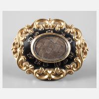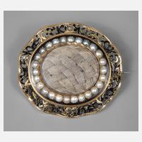 um 1830, Gelbgold geprüft 585/1000, mittig feine Flechtarbeit aus Haar hinter Glas, umgeben von Perlenband auf schwarzem Lackgrund sowie Kranz aus durchbrochen gearbeiteten floralen Elementen mit Resten alter Farbfassung, rückseitig bezeichnet: In Memory of Agnes, Nadel ergänzt, Maße ca. 47 x 44 mm, G ca. 21,4 g.