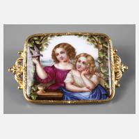 um 1830, Metall vergoldet, leicht konvex gebogene rechteckige Porzellanplatte mit feiner Malerei eines Geschwisterpaars mit Taube, Maße ca. 33 x 53 mm.