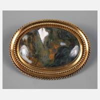 um 1830, Gelbgold geprüft 585/1000, mittig besetzt mit ovalem Cabochon aus Moosachat mit lebhafter Zeichnung (kleiner Sprung), umgeben von Perlbändern bzw. kordiertem Draht, auch als Anhänger zu tragen, Maße ca. 50 x 40 mm, G ca. 18,6 g.