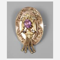 um 1840, Punze ER, ovale Form, besetzt mit oval facettiertem Amethyst in Krappenfassung sowie einer Perle und einem Saphir, umgeben von plastisch gearbeitetem, fein ziseliertem Blattwerk, vier abgehängte Kettchen, leichte Altersspuren, Maße ca. 32 x 24 mm, G ca. 4,6 g.