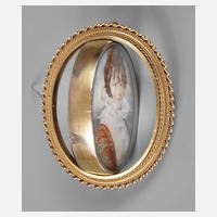 um 1830, Gelbgold geprüft 333/1000, drehbares ovales Medaillon mit feiner Elfenbeinminiatur und fein gelegten Haarlocken, umgeben von fünf feinen Bändern aus Draht, auch als Anhänger zu tragen, minimale Tragespuren, Maße 52 x 43 mm, G gesamt ca. 24,3 g.