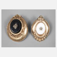 2. Hälfte 19. Jh., wohl Neapel, Messing, 1) mit Muschelkamee, mit dem Bildnis eines antiken Kriegers, auch als Anhänger zu tragen, Maße ca. 31 x 25 cm, 2) mit Kamee aus leicht marmorierter Glaspaste mit antikisierenden Damenportrait, Maße ca. 35 x 29 mm, unterschiedliche Erhaltungen.
