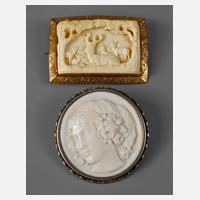 Anfang 20. Jh., 1) Silber gestempelt 800, besetzt mit runder Elfenbeinschnitzerei mit der Darstellung einer jungen Frau mit hochgestecktem blütengeschmückten Haar, auch als Anhänger zu tragen, D 41 mm, 2) Metall vergoldet, mit jagdlicher Elfenbeinschnitzerei, Maße ca. 32 x 46 mm.
