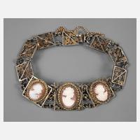 Ende 19. Jh., Silber geprüft, filigrane Schmuckglieder von bis zu 18 x 18 mm, besetzt mit drei Muschelkameen (eine gebrochen), Kastenschloss mit Sicherheitskettchen, Tragespuren, L ca. 18,5 cm, G ca. 14,4 g.