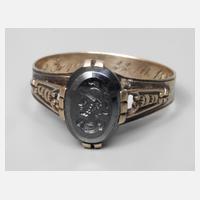 datiert 1890, Gelbgold gestempelt 330, sich zum ca. 13 mm hohen Ringkopf leicht verbreiternde Schiene, besetzt mit ovaler Hämatitgemme mit der Darstellung eines römischen Kriegers, auf Innenseite Ringschiene graviert: J. Max Enge, 22.11.1890, RW 22 mm, G ca. 3,8 g.