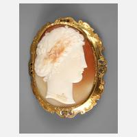 um 1860, Gelbgold geprüft 585, besetzt mit fein geschnittener Muschelkamee mit dem antikisierenden Profil einer jungen Dame mit hochgestecktem Haar, in teils durchbrochen gearbeiteter Goldfassung, minimale Altersspuren, Maße ca. 62 x 51 mm, G ca. 16,2 g, in originalem Etui der Zeit.
