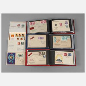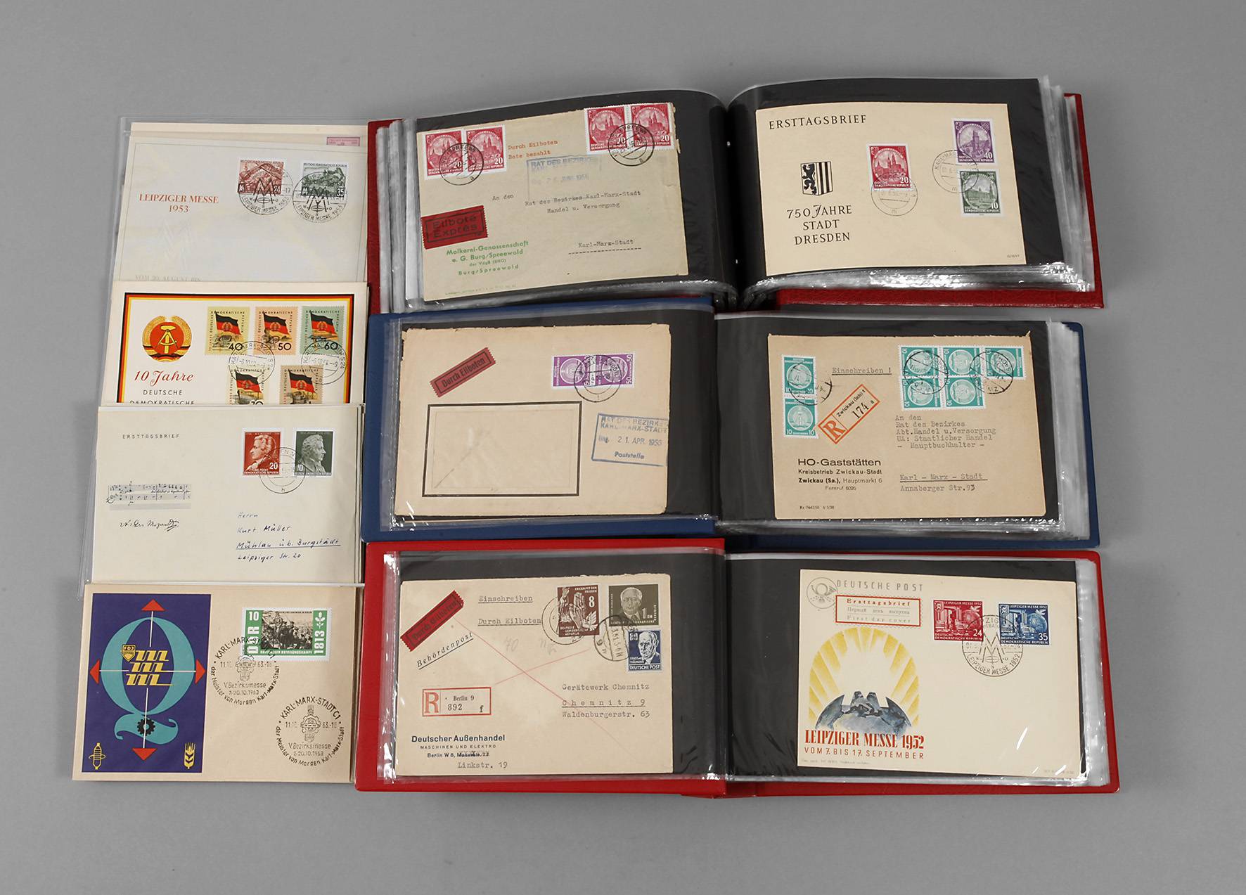 Anfang 1950er Jahre, über 200 echt gelaufene Belege aller Versandarten (ETB, R-Brief, Eilboten, vertrauliche Dienstsache etc.), dabei umfangreiche Dienstpostbelege mit tlw. seltenen Destinationen, zudem loses Briefematerial mit Anteil Messebelege.