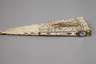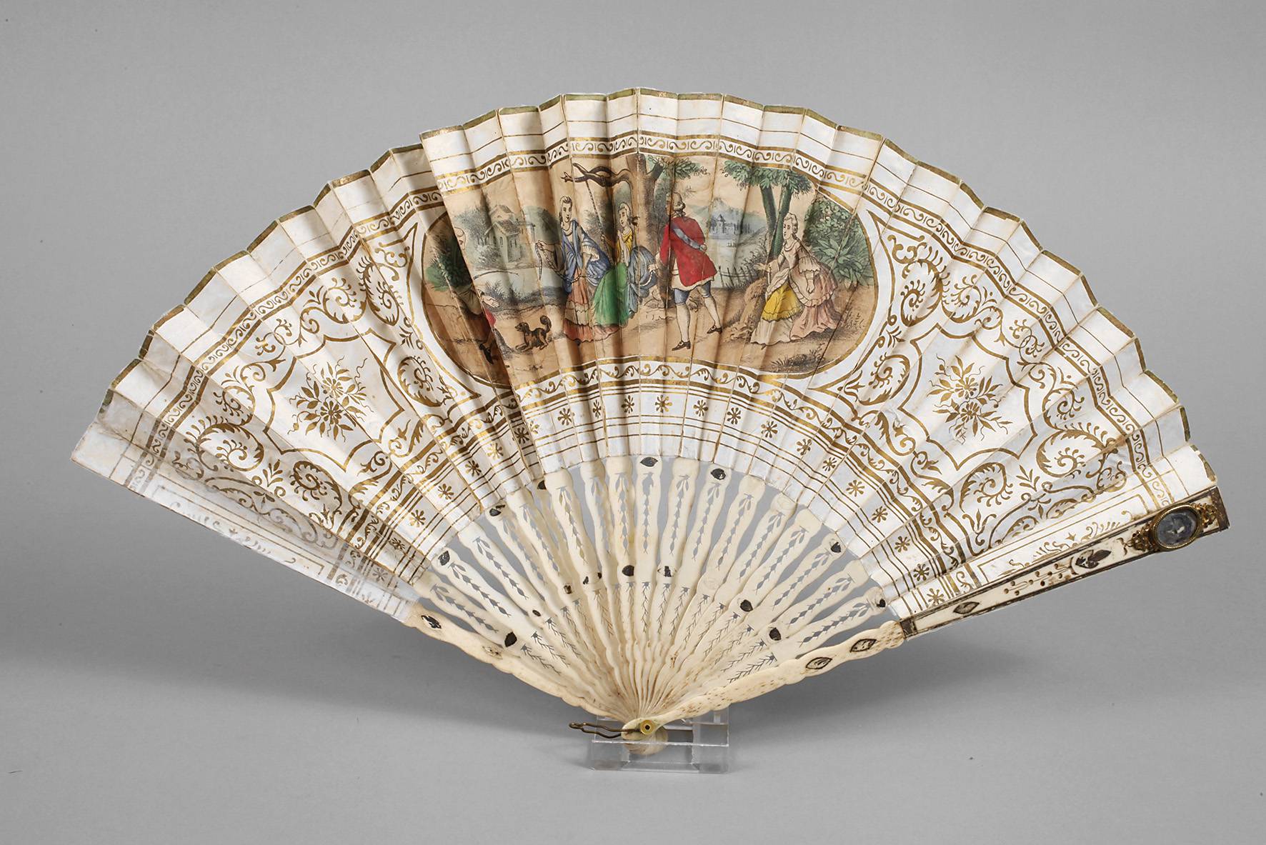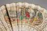 um 1880, durchbrochen gearbeitetes Gestänge aus Bein, teils geschwärzt, plissierte Papierbespannung, diese mit vergoldeten Rocaillen verziert, im Mittelfeld mit eingesetzter Kartusche mit koloriertem Stich, später rückseitig hinterlegt, Altersspuren, L 27 cm.