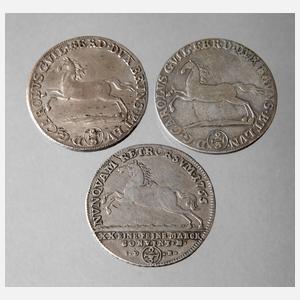 1) 1/2 Konventionstaler Karl I. 1765, Variante mit Ohren des Pferdes unter dem E, Silber, leichte Schrötlingsfehler, ss, Silber, G ca. 13,8 g, 2) 24 Marien-Groschen 1789, Variante mit größerem Abstand zwischen 1789 und Rosette, ss, Silber, G ca. 16,9 g, 3) dergleichen 1797, leichte Schrötlingsfehler, ss, Silber, G ca. 17,1 g.