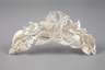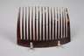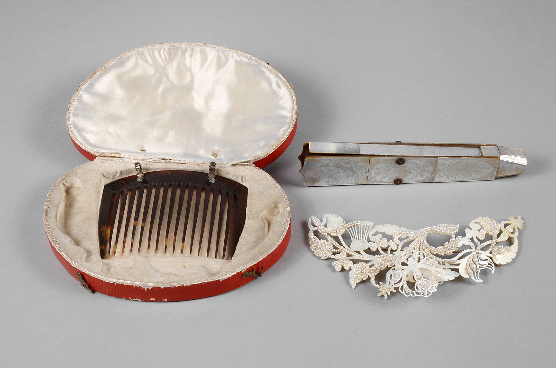 um 1890, Schildpatt geschnitzt, Kamm mit Metallmontierung zum Einklipsen des aufwendig gestalteten Aufsatzes, mehrteilig aus Perlmutt gearbeitet, besetzt mit feinen Saatperlchen, auch einzeln als Verzierung zu tragen, nicht ganz komplett, im original Etui, dazu allseitig mit gravierten Perlmuttsegmenten verziertes Fächeretui, Altersspuren, L Etui 18,5 cm.