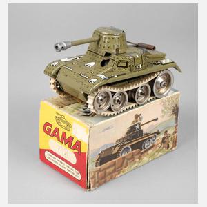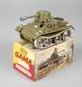 1960er Jahre, gemarkt Gama D.R.G.M., Made in Western Germany sowie Bezeichnung, Blech feldgrün lithogr., Panzer mit intaktem Uhrwerkantrieb und Zündsteinfunktion, Stopp/Go-Schalter, einem Geschützrohr und Kunststoff-Figur, welche während der Fahrt aus dem Turm schaut, orig. Gummiraupen altersbedingt porös, unbespieltes Vitrinenmodell, korrodierter Schlüssel ergänzt, in orig. Karton, dieser etwas lädiert und fixiert, L 13,5 cm.
