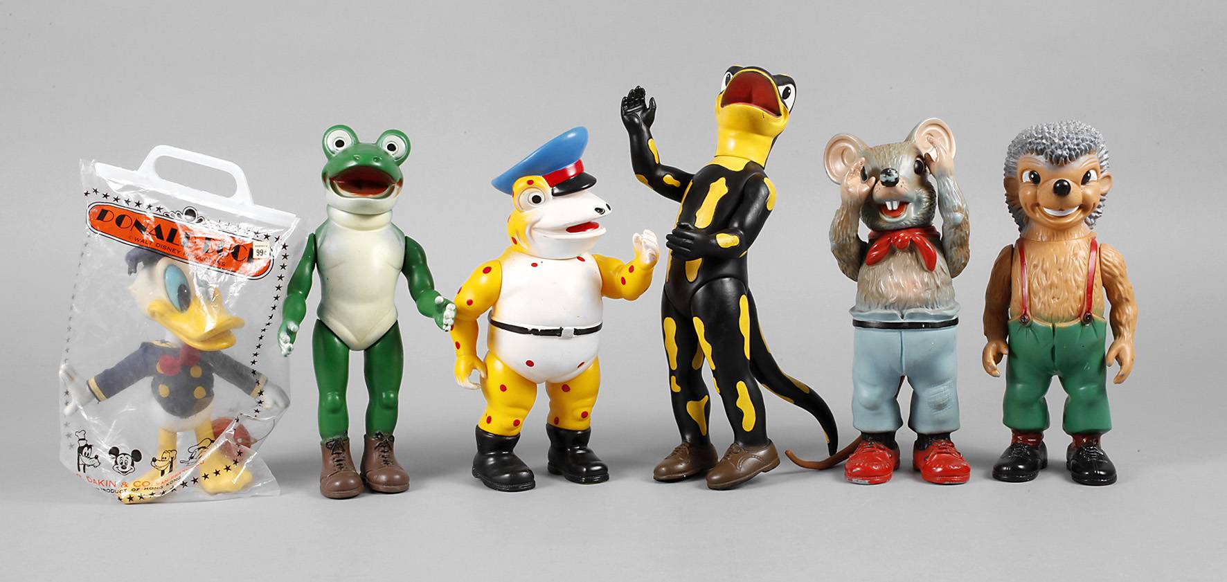 1960er Jahre, gemarkt, Hartgummi farbig gefasst, bestehend aus gegliedertem Igelmann, Mäusepiep, Lurchi, Unkerich und Hopps der Salamander-AG in Kornwestheim, minimaler Farbabrieb, H 28 cm (4 x) und 33 cm, sowie Donald Duck mit Stoffkleidung der Walt Disney Productions, R. Dakin & Co. San Francisco, No. 2244, mit orig. Etikett und Verkaufsbeutel, H 21 cm.