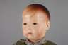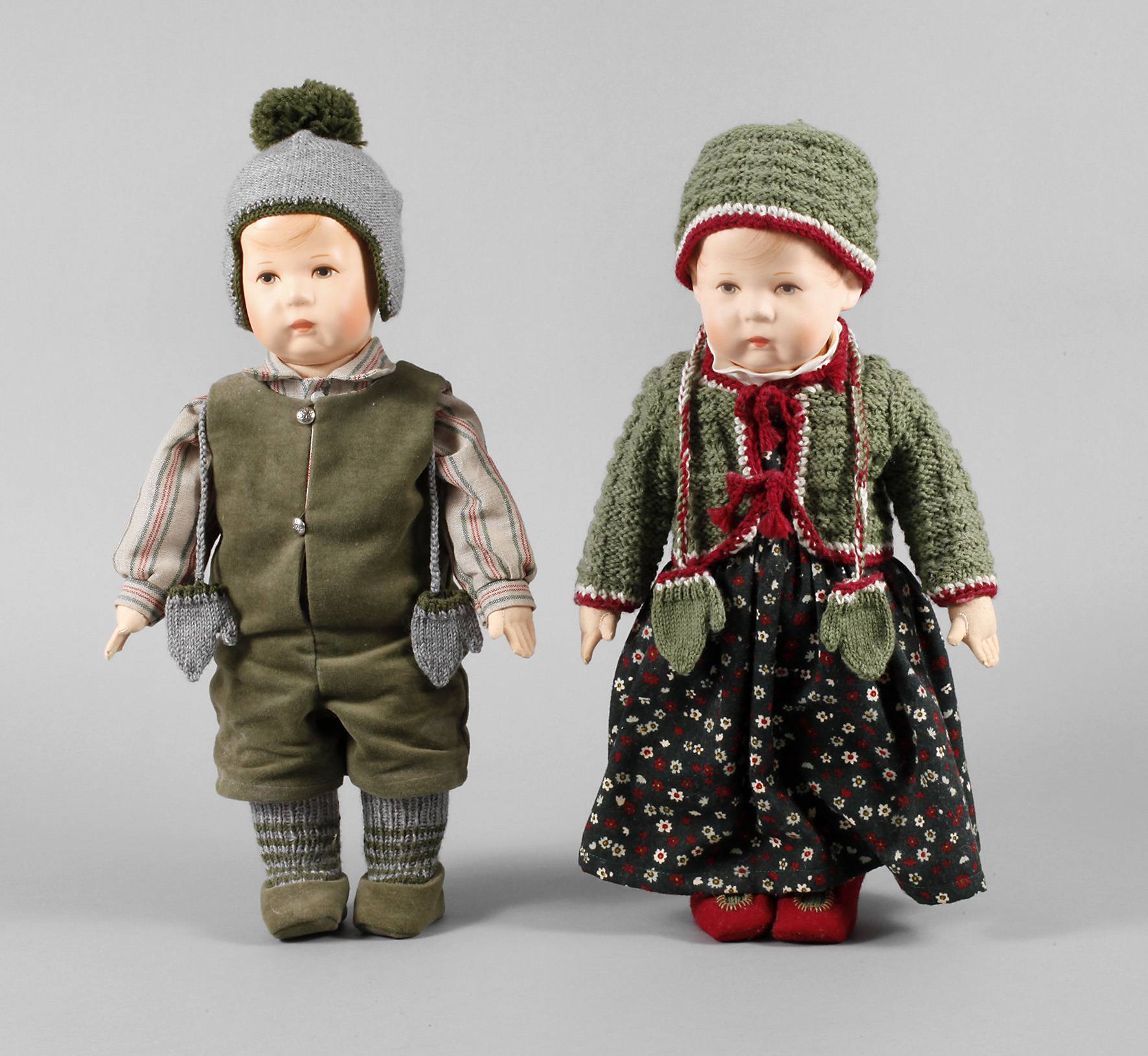 Replik der Puppe Typ 1 von 1913, limitierte Auflage 1999 bzw. 2002, Nr. 152 und Nr. 425 (von je 500), jeweils gestempelte Fußsohlen mit Schriftzug und Nummer, fein bemalter Nesselkopf mit drei Hinterkopfnähten, fest angenäht an Nesselkörper mit je zwei Nähten vorn, hinten und an den Seiten, breiten Hüften, Schlenkerarmen sowie gescheibten Beinen aus je fünf Stoffteilen, Finger und Zehen abgesteppt, Daumen extra angenäht, in mehrteiliger Originalkleidung, mit Puppenständer aus Metall und orig. Karton, unbespielte Vitrinenstücke, lediglich Knabe mit minimalst gelockerter Halsnaht, stecknadelkopfgroßem Farbabrieb am Hinterkopf und ohne die beiden Teddybären als Beigabe anlässlich des 100-jährigen Jubiläums, H je 34 cm.