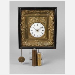 um 1860, Messingblech geprägt und vergoldet, Emailziffernblatt, von zwei Engeln und Schwan bekrönt, Holzplatinenwerk mit Halbstundenschlag auf Tonspirale, Email mit kleiner Fehlstelle und einem Haarriss, Zeiger ergänzt, Werk läuft, Maße 26 x 24 x 13 cm.