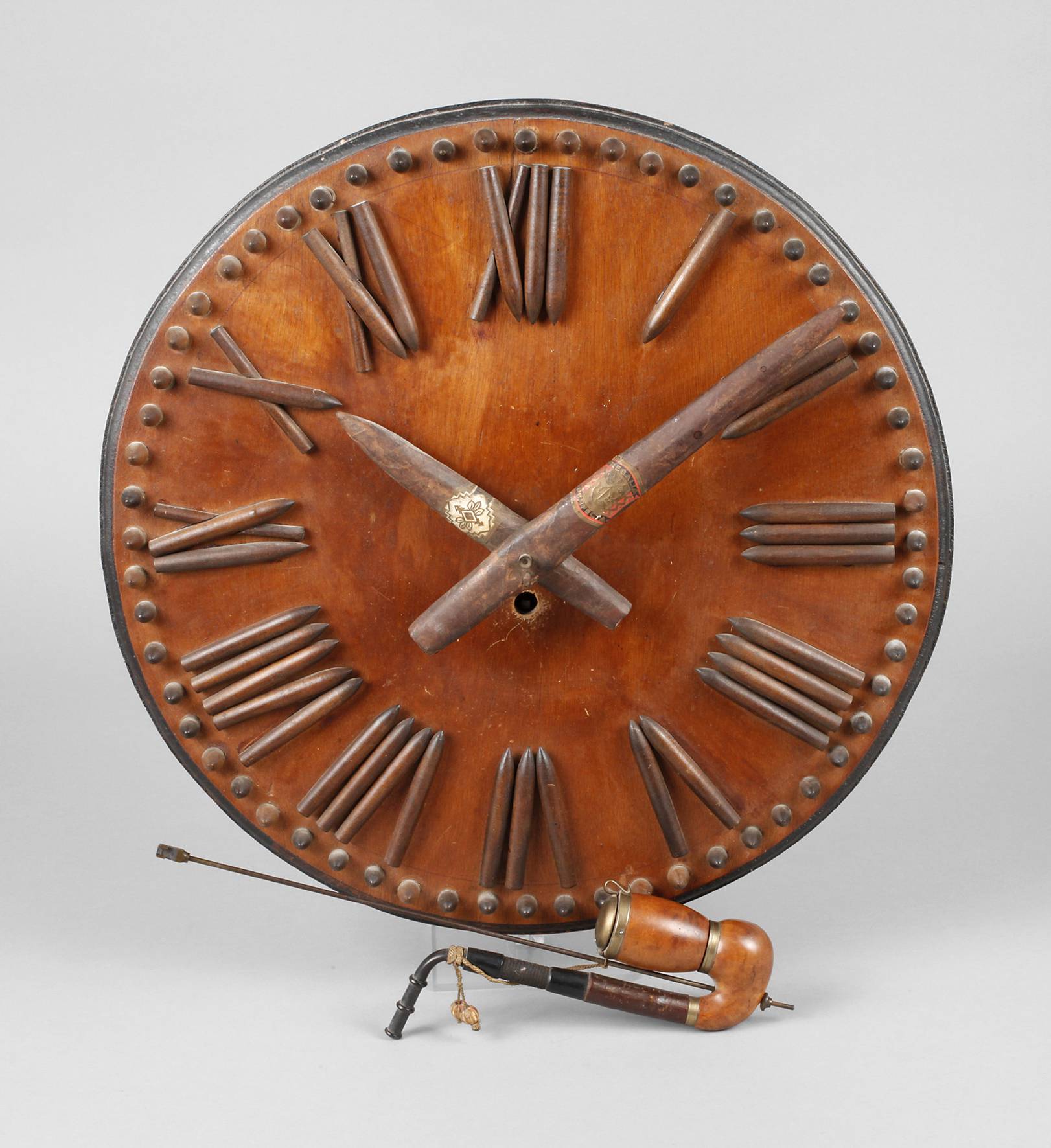 um 1920, nussbaumfurniertes Ziffernblatt mit römischen Ziffern in Form von Zigarren, die Zeiger aus echten Zigarren gefertigt, Pendel in Form einer Pfeife, einfaches Messingplatinenwerk, funktionstüchtig, mit Schlüssel, D 40 cm.