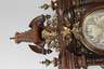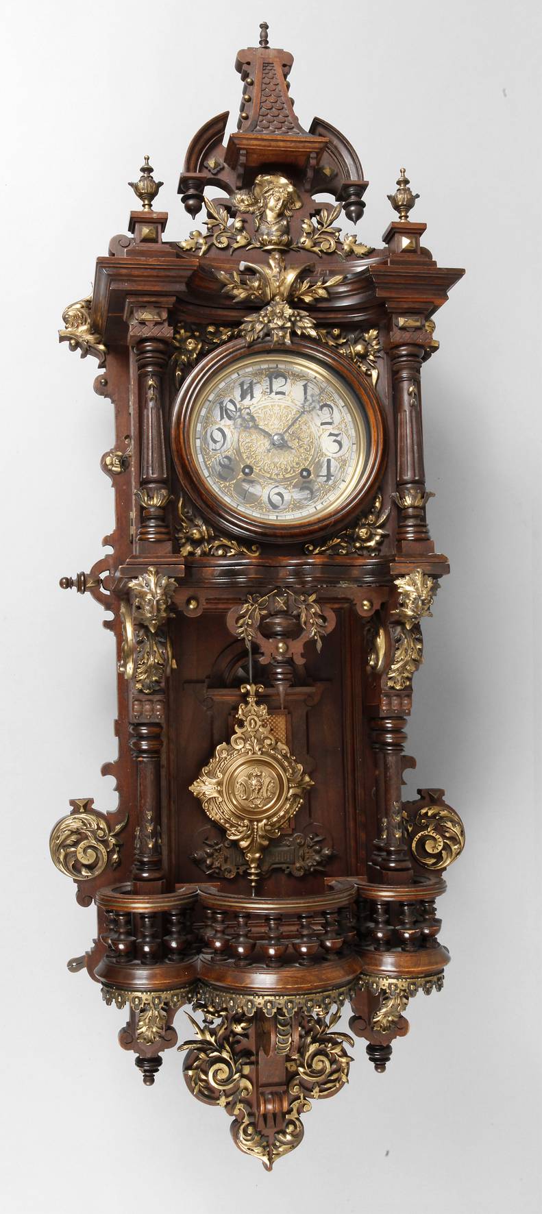 auf Werkplatine gemarkt Gustav Becker, um 1880, aufwendig verziertes Nussbaumgehäuse mit gedrechselten Balustraden und Vollsäulen, teils figürlich gestalteter Bronzezierrat, Werk mit Halbstundenschlag auf Tonfeder, funktionstüchtig, in gutem originalem Zustand, H 100 x b 37 x T 16 cm.