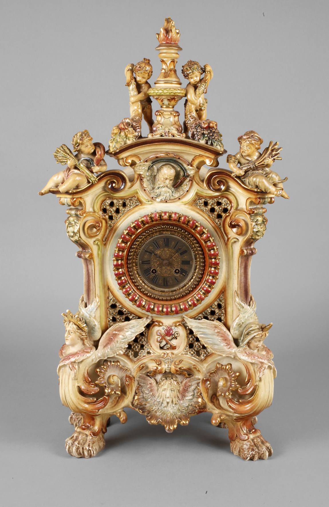gemarkt Hugo Lonitz Neuhaldensleben, um 1880, mit Uhrwerk von Gustav Becker, prächtiges Keramikgehäuse, durchbrochen gearbeitet, farbig bemalt und vergoldet, mit figürlichen Allegorien verziert, Darstellung der vier Jahreszeiten sowie Tag und Nacht, Gehäuse an zwei Stellen geklebt, Fuß einer Putte fehlt, minimal bestoßen, Uhrwerk mit Halbstundenschlag auf Tonfeder, Werk reinigungsbedürftig, Gehwerk läuft an, Schlag rep. bed., mit Schlüssel, H 71 cm.