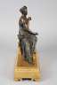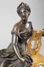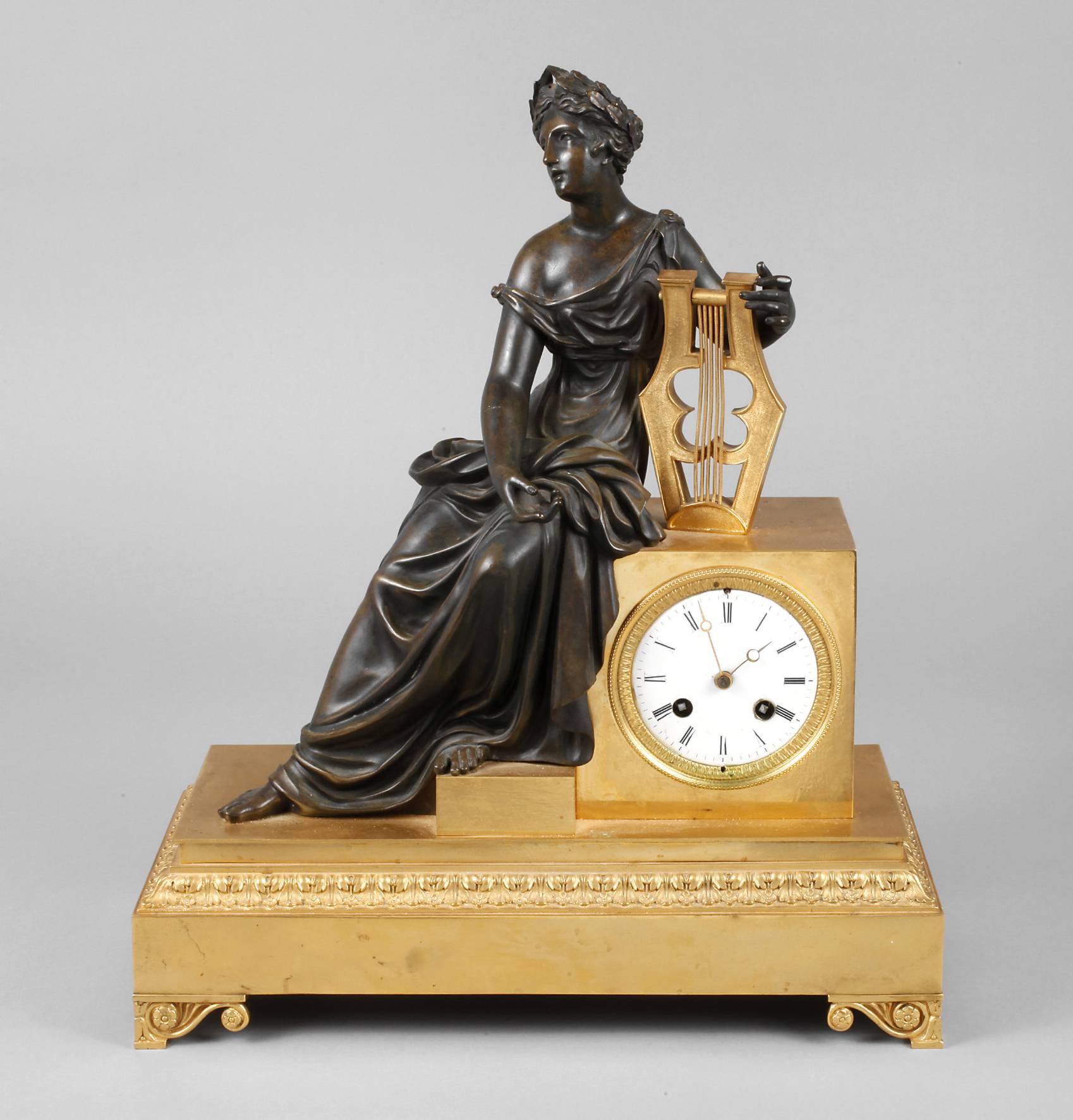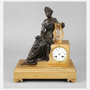 Frankreich, 19. Jh., Bronze feuervergoldet, tlw. braun patiniert, Darstellung einer antiken Schönheit mit Lyraharfe, der Sockel umlaufend mit fein ziseliertem Palmettenfries verziert, Emailziffernblatt mit römischen Zahlen und zwei Haarrissen, Pendulenwerk mit Halbstundenschlag auf Glocke, gemarkt JAPY, Pendelfeder beschädigt, Werk läuft an, Maße 44 x 37 x 15 cm.