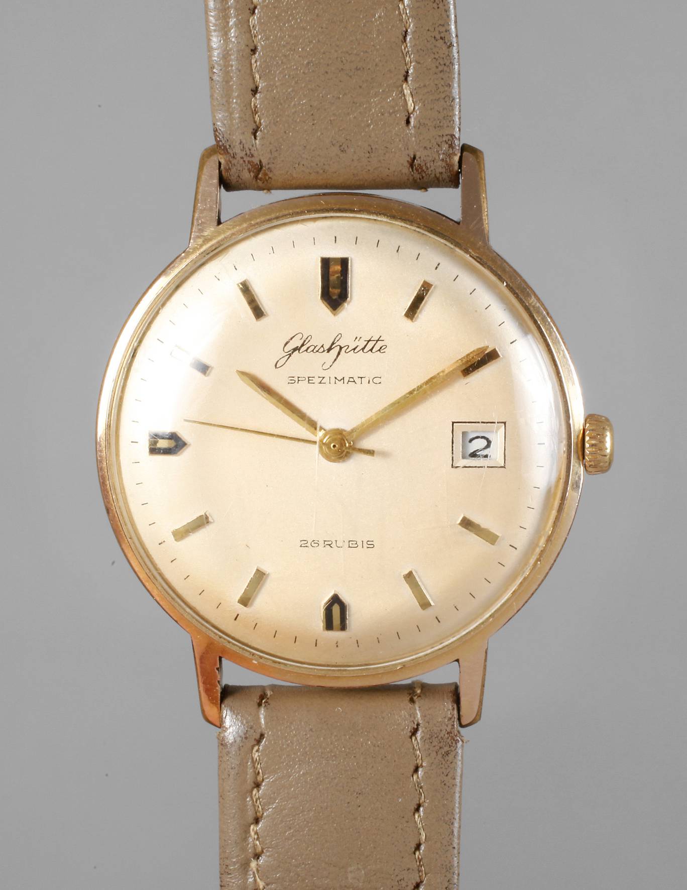1960er Jahre, Modell ”Spezimatic”, Automatikwerk mit 26 Steinen, Zentralsekunde und Datum, vergoldetes Gehäuse mit Nummer 095112, funktionstüchtig, Z 2, D 35 mm.