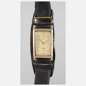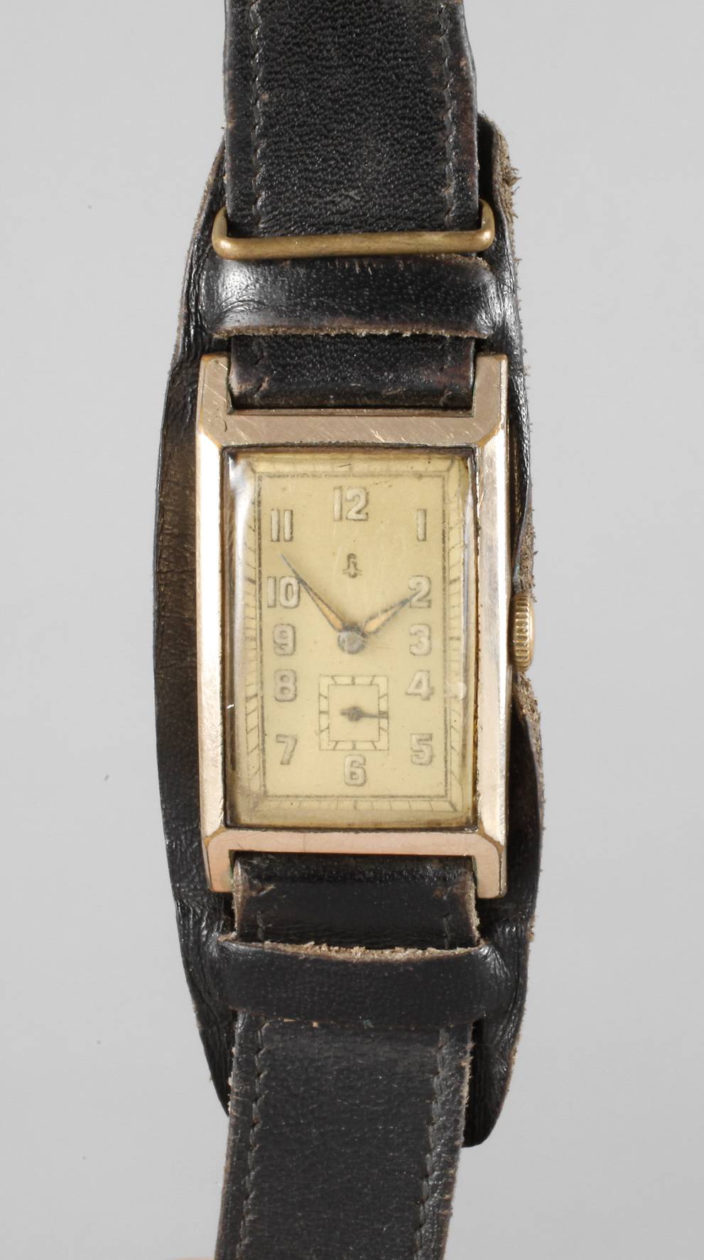 1930er Jahre, auf dem Boden gemarkt ”Uhrenfabrik AG Glashütte (Sa)”, Gehäuse in 20 Mikron Walzdoublé, hochrechteckige Gehäuseform, vergoldetes Ziffernblatt mit Leuchtziffern und -zeigern, kleine Sekunde, an altem Lederarmband, Tragespuren, Z 2-, Werk rep.bed., 40 x 22 mm.