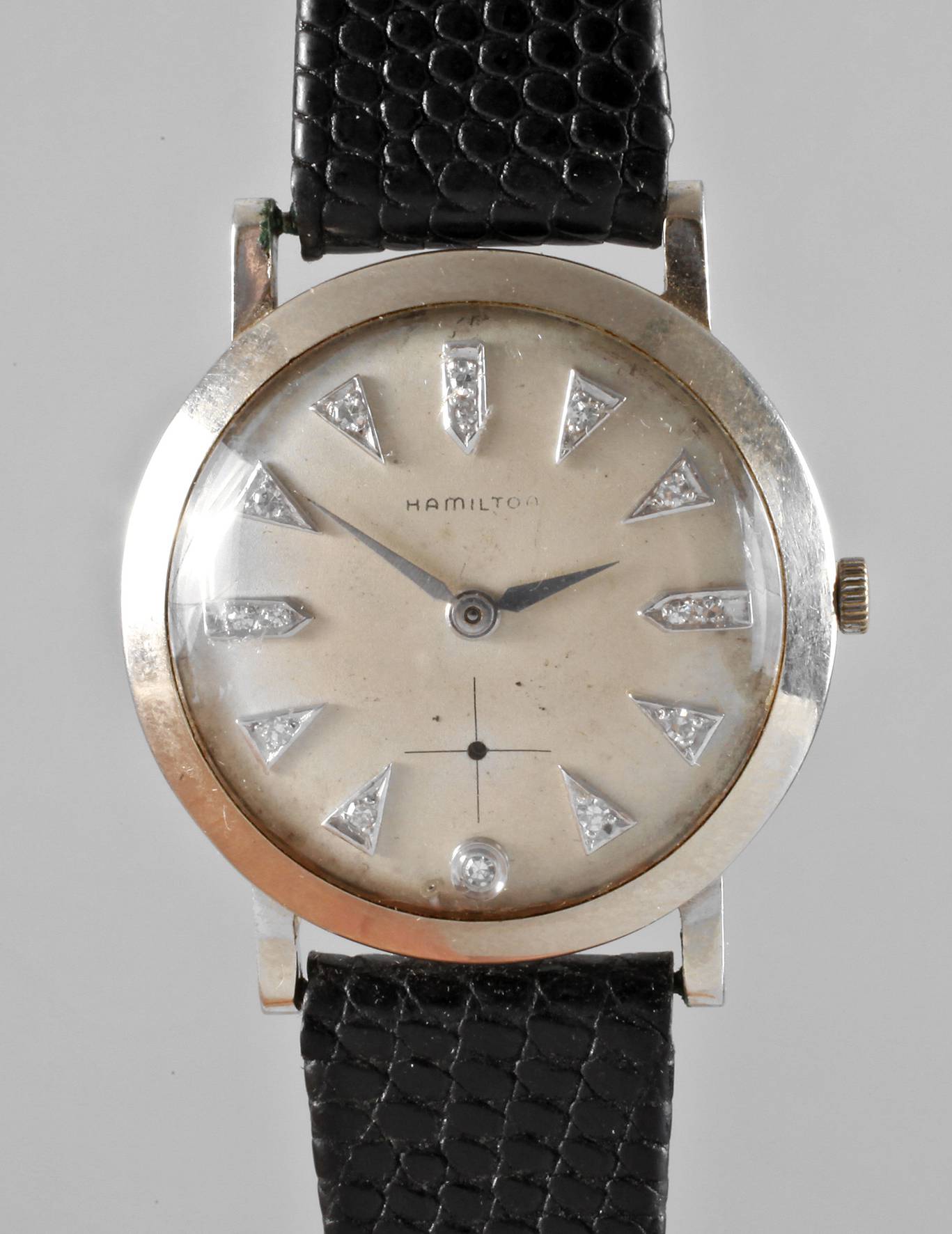 USA, 1930er Jahre, auf Werk gemarkt ”Hamilton 747”, poliertes Ankerwerk mit 17 Steinen, Weißgoldgehäuse gestempelt 14K, Ziffern mit kleinen Brillanten besetzt, an schwarzem Lederarmband, funktionstüchtig, D 30 mm, G ca. 16 g.