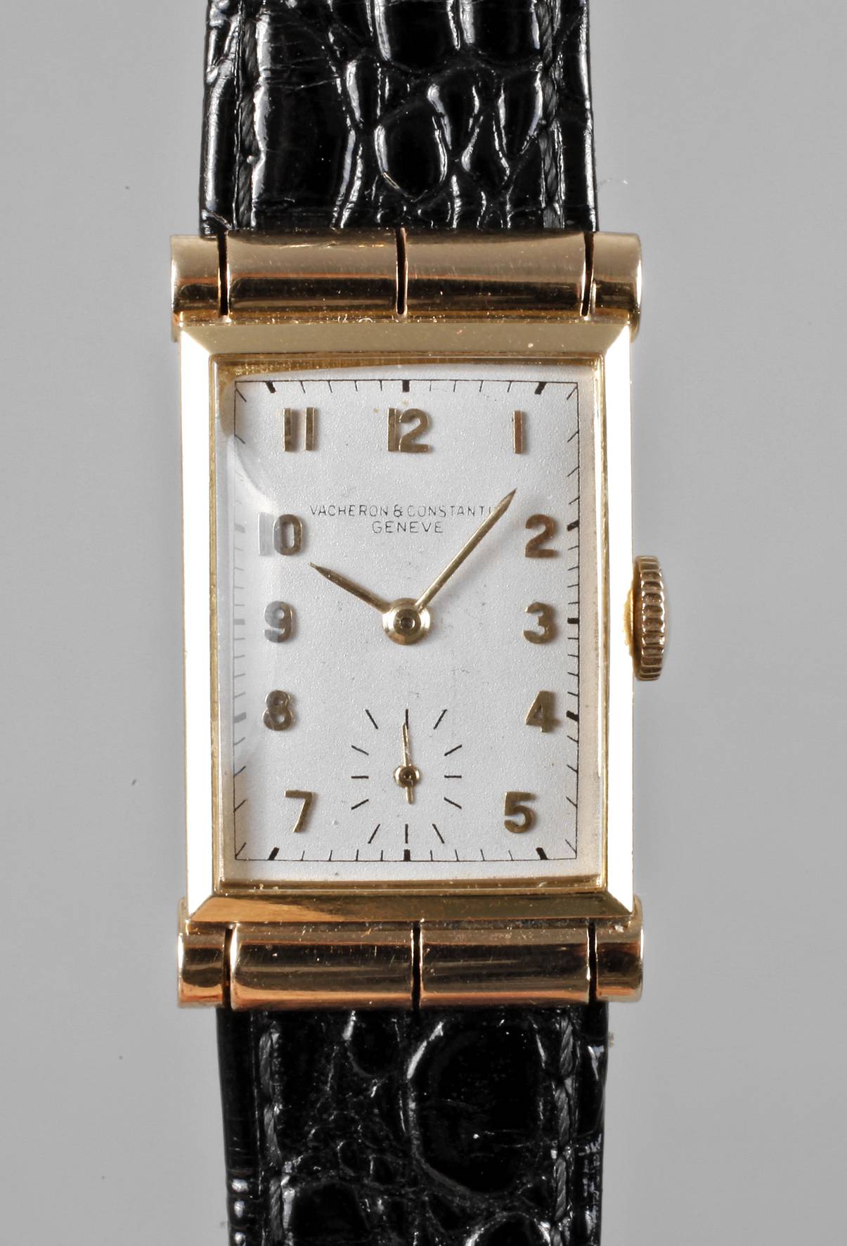 Schweiz, um 1938, feines 14K-Gelbgoldgehäuse, Ankerwerk mit Handaufzug, auf Ziffernblatt und Werk gemarkt, hochrechteckiges versilbertes Ziffernblatt mit arabischen Zahlen und kleiner Sekunde, an schwarzem Lederarmband, sehr guter Zustand, funktionstüchtig, H 35 x B 21 mm, G ca. 29 g.