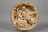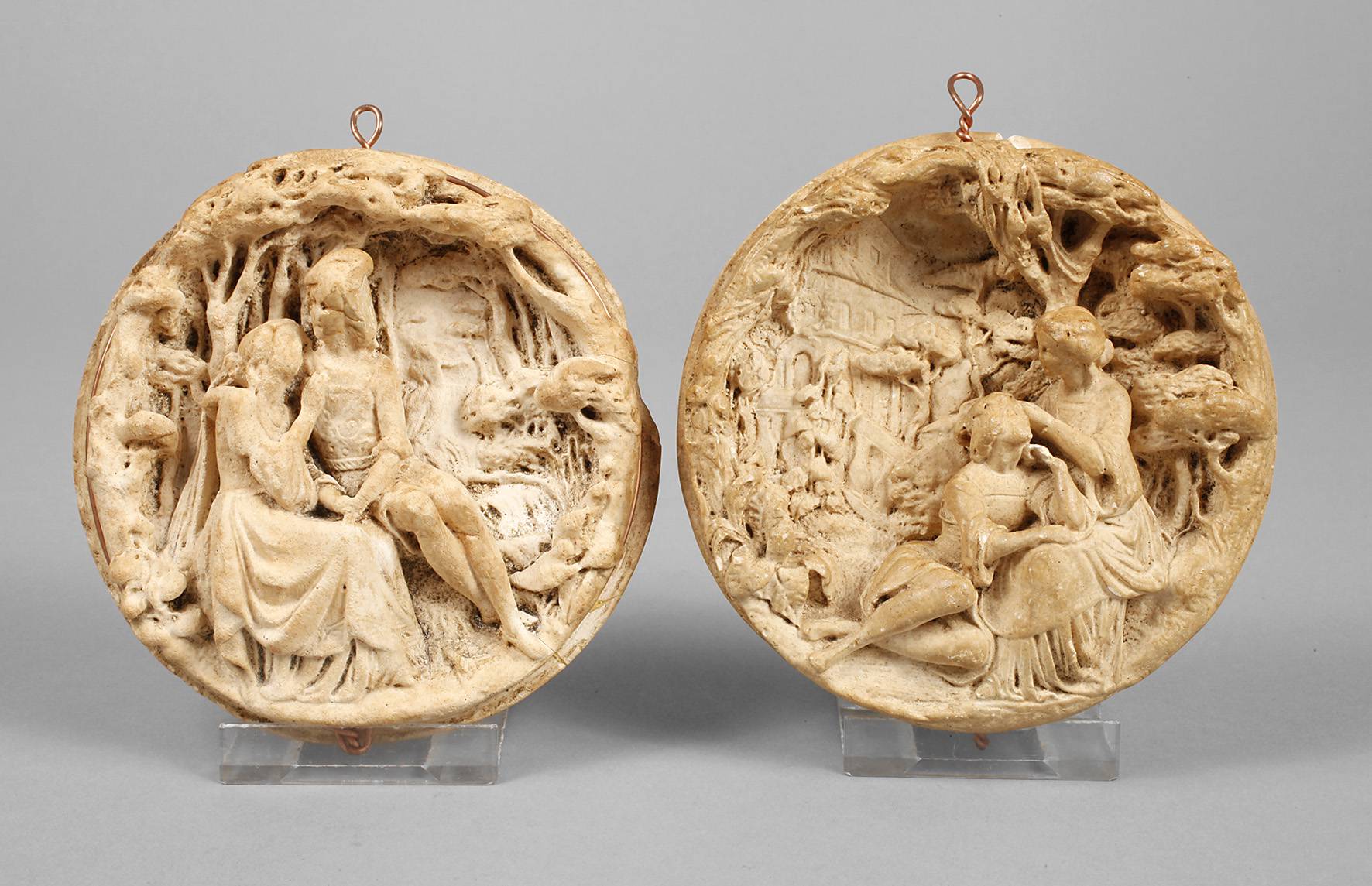 Frankreich, 19. Jh., jeweils signiert Ed. Ende, Meerschaum fein beschnitzt, Tondi mit amourösen Szenen in arkadischer Landschaft, stärkere Altersspuren, D ca. 12 cm.