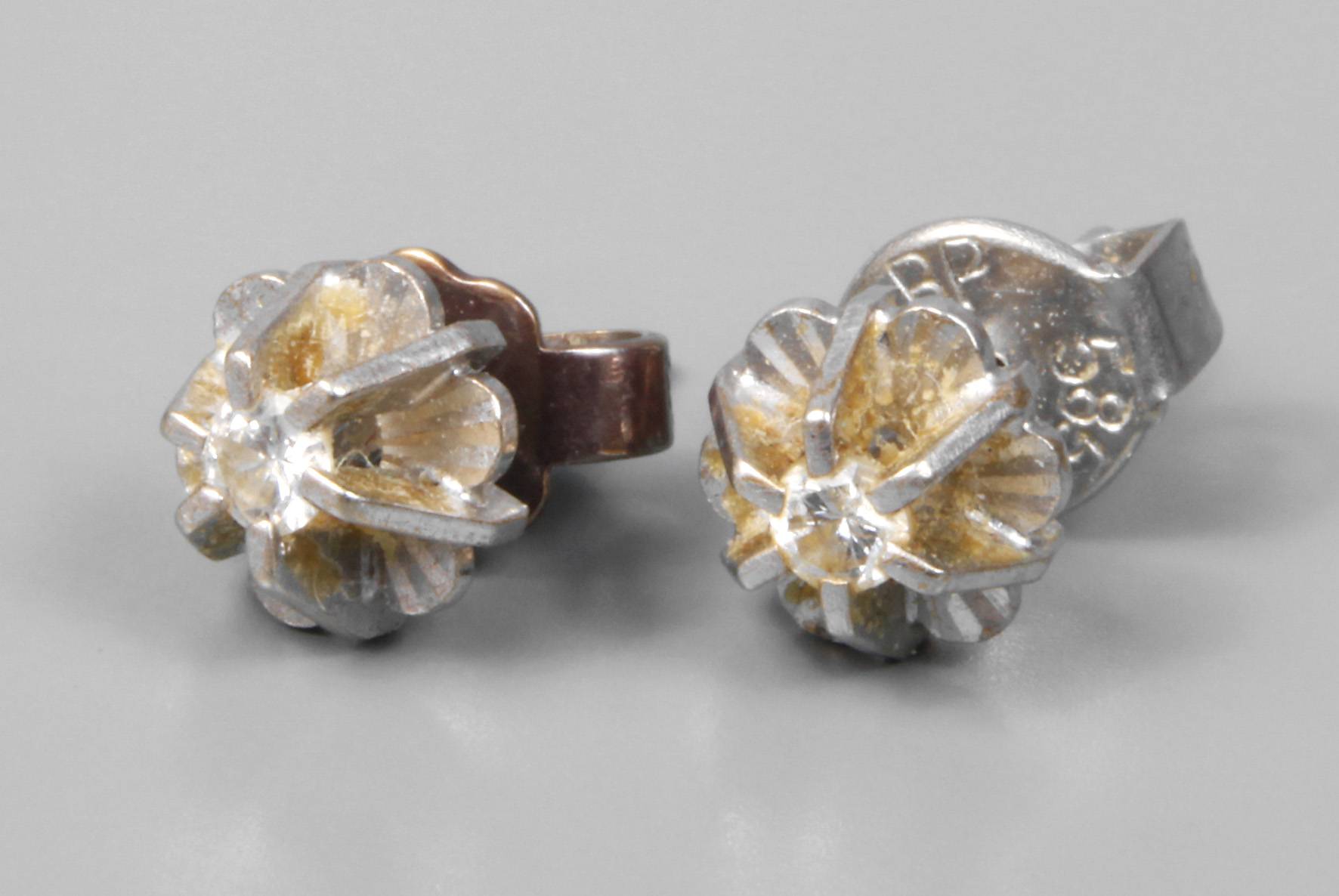 um 2000, Weißgold gestempelt 585, in Blütenform, mittig besetzt mit je einem Brillanten von je ca. 0,05 ct, leichte Tragespuren, G gesamt ca. 2 g.